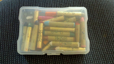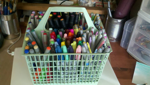 We have been remodeling the house recently so there was no longer a place for my art...until now. I guess when i'm forced to be organized I really can do it! I used an old dishwasher silverware holder to organize all of my sharpies and some other felt pens, I have also found that photo boxes are great for holding all sorts of things, in fact I use them for almost everything! Small stackable drawers hold all of my drawing supplies, colored pencils and copic markers. I use recycled food cans to house most of my paintbrushes and the little corner shelf usually has a lot more paints in it, so they stand up better than in the picture. I'm so excited about my new little space!