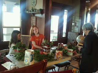 3. Arrange your greens and other Holiday themed things inside the jar. Make sure your arrangement is full enough so that when it's finished you don't see any of the hole in the box.